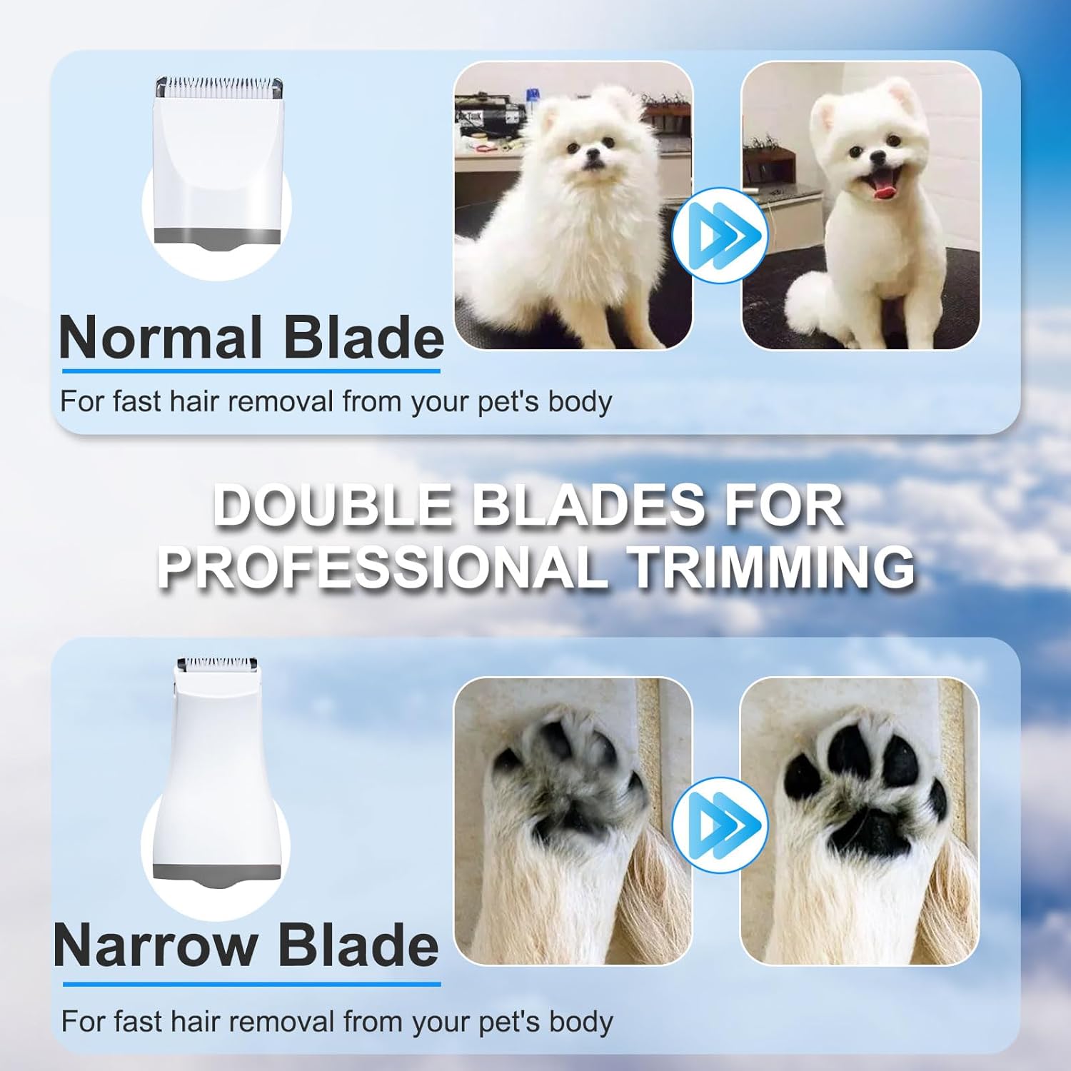 - Safety & Precision Trimming: Featuring upgraded dual blades made from stainless steel and ceramic, these clippers stay sharp and provide a safe grooming experience. The standard head (1.25″) is ideal for body trimming, while the delicate narrow head (0.6″) is perfect for more detailed areas like paws, eyes, ears, and the butt.