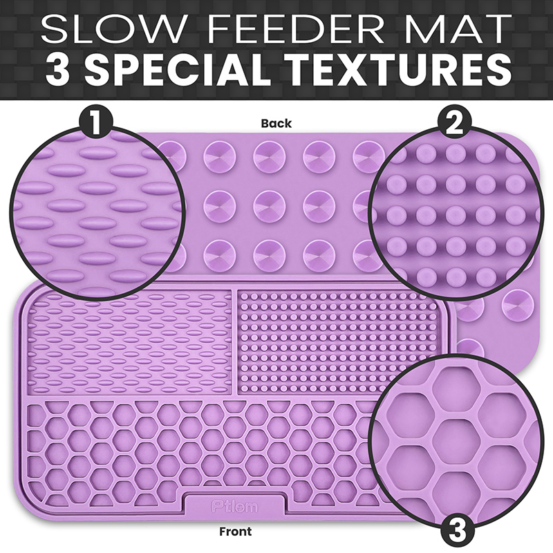 With dimensions of 22.6CMX12.5CM, our slow feeding mat is suitable for pets of all sizes. Available in sleek black, vibrant green, calming gray, and elegant purple, you can choose the perfect color to complement your home decor.