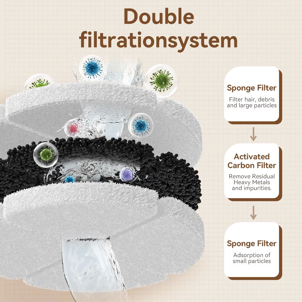 This pet water fountain is packed with advanced features to keep your pet hydrated and healthy. The dual radar sensors cover a wide 180° angle, precisely detecting your pet’s movement to release water only when needed, saving energy and ensuring durability. The dual filtration system, combining a sponge filter and an activated carbon filter, removes hair, debris, and impurities, providing your pet with pure, clean water.